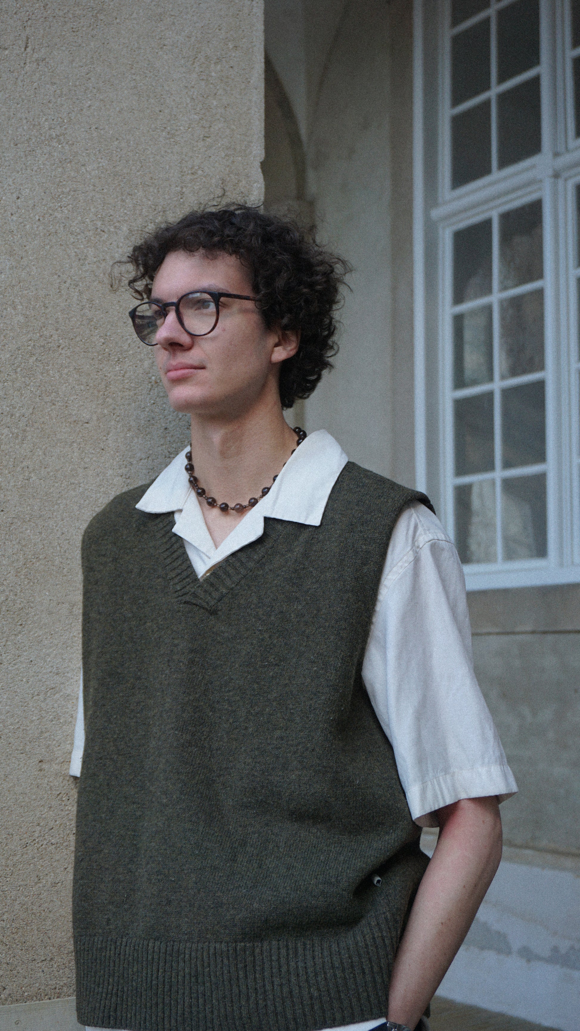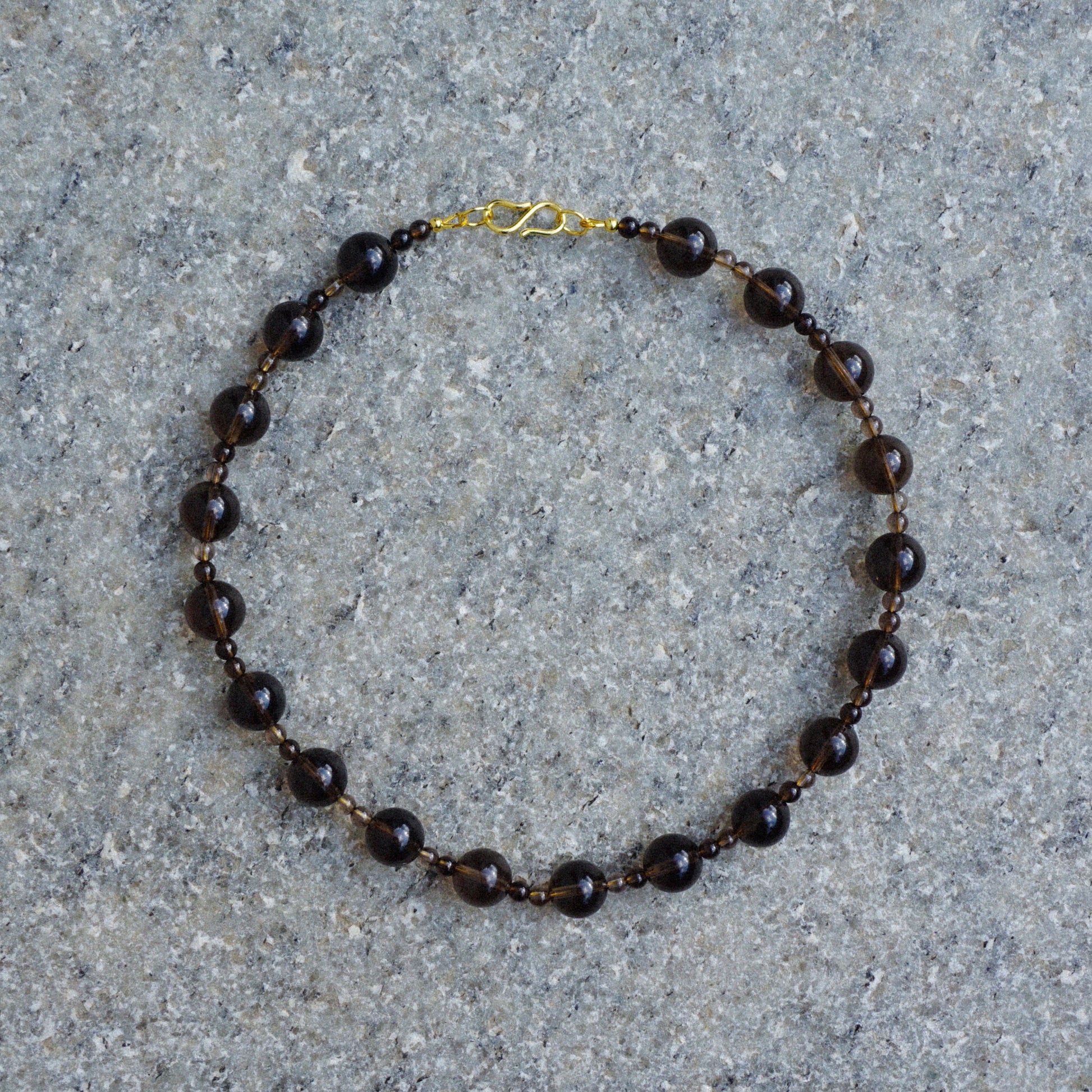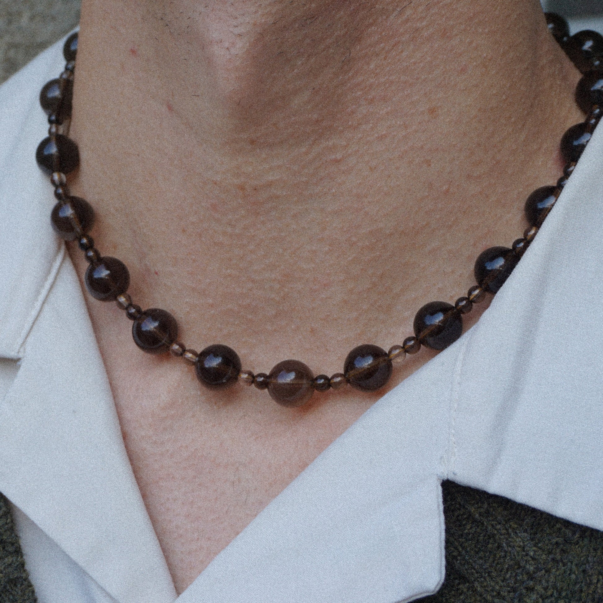 Demetré halskæde er lavet af røgkvarts perler som har en gennemsigtig brun farve. Den lille perle måler 4 mm og den store perle måler 12 mm.