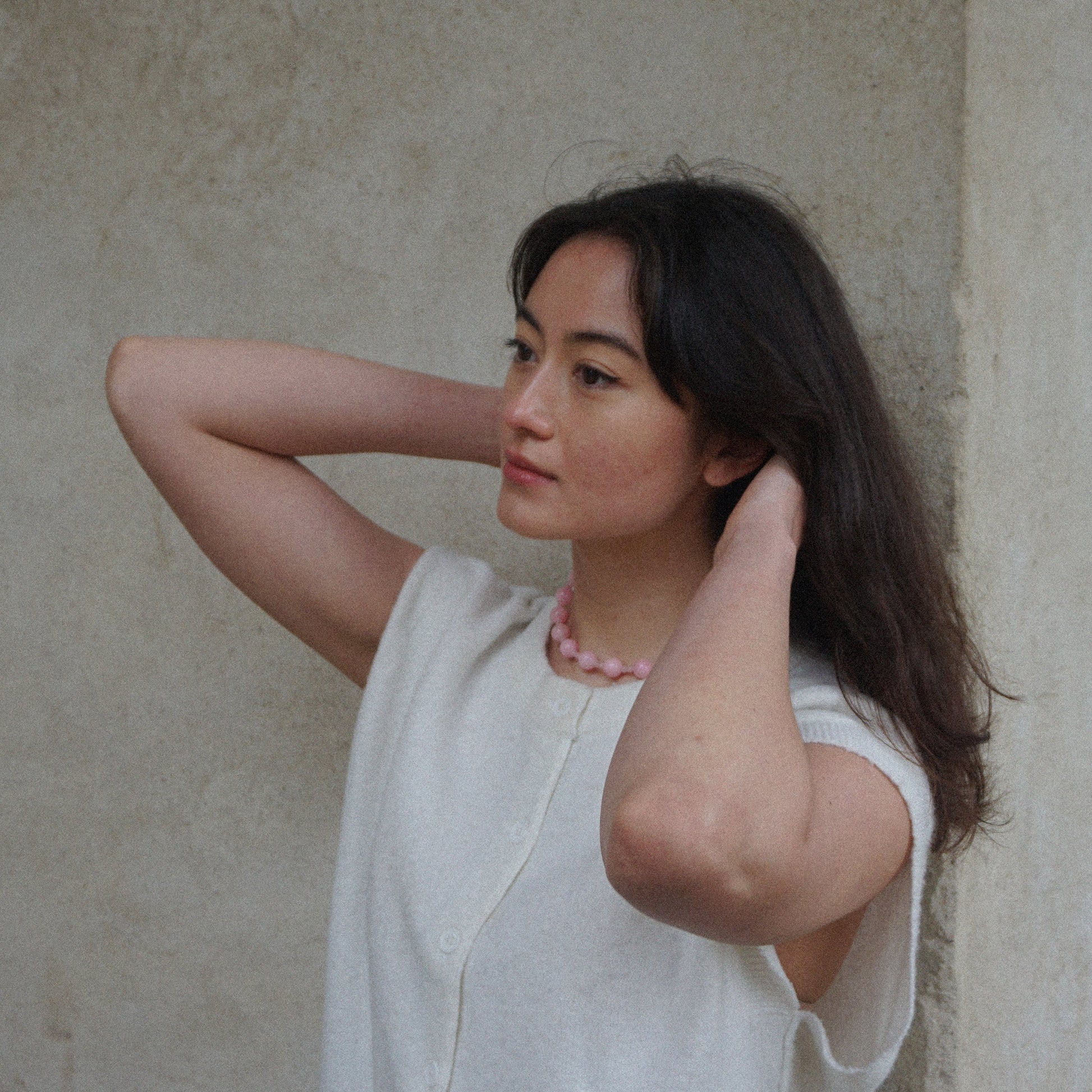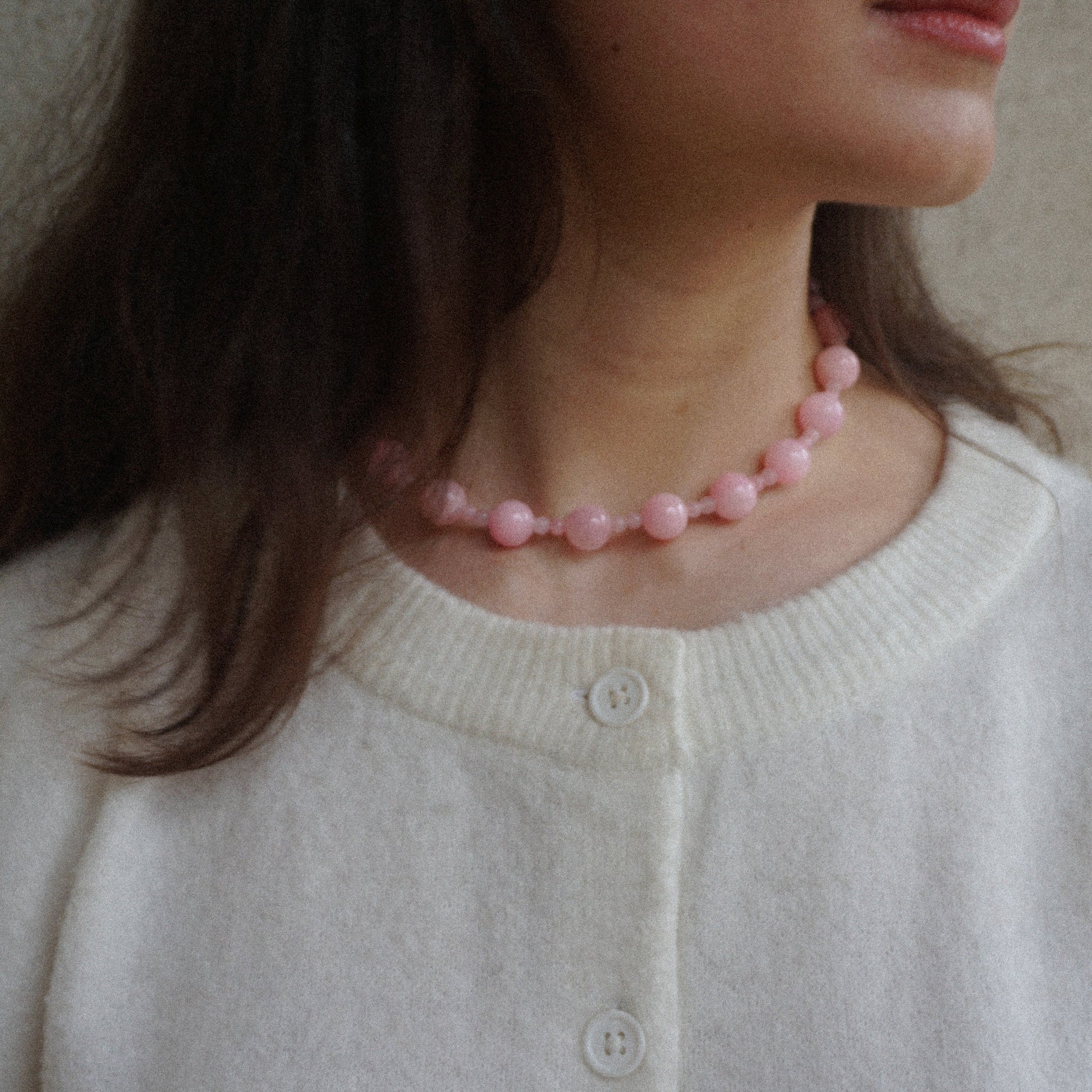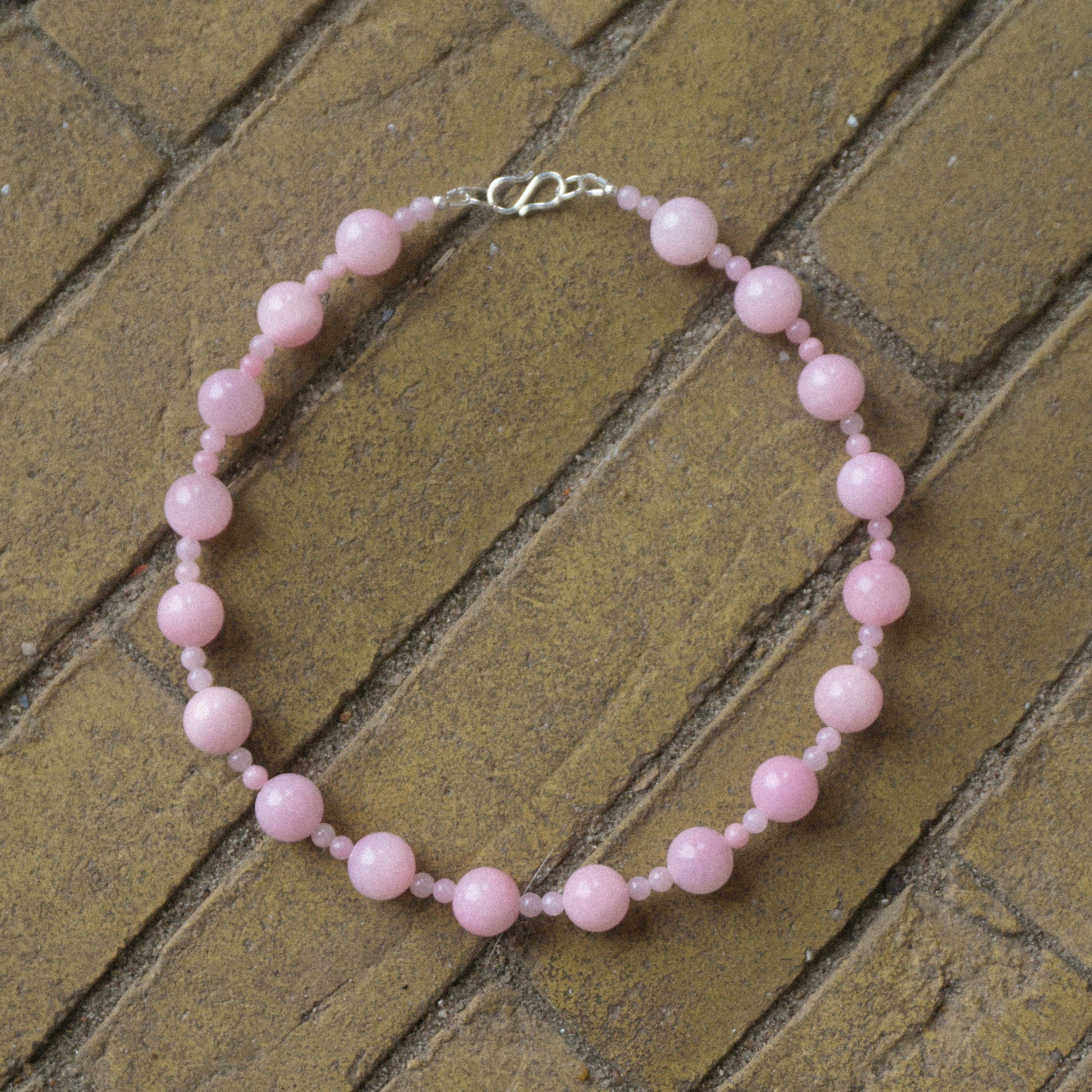 Dupré halskæde er lavet af skinnende jade perler i en sart pink farve. Den lille perle måler 4 mm og den store perle måler 12 mm.